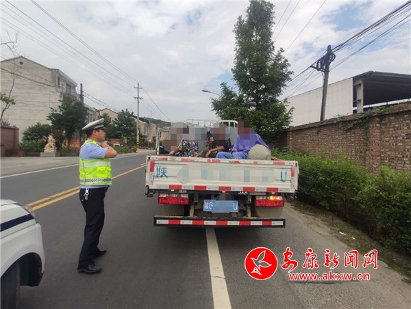 7月31日15時(shí)許,大隊(duì)執(zhí)勤民警在316國道沿線開展路面巡邏,行至恒口東大門時(shí),發(fā)現(xiàn)一輛號(hào)牌為皖A(yù)C***C號(hào)輕型欄板貨車后車廂有違規(guī)載人嫌疑,巡邏民警立即上前攔停,示意駕駛?cè)死钅衬惩\嚱邮軝z查。經(jīng)查,該貨車核定載人數(shù)為5人,實(shí)際載9人,貨車車廂違法載客4人,屬于貨車違法載客的嚴(yán)重交通違法行為。