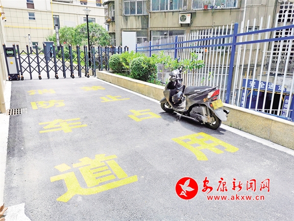 ?6月22日,安康城區(qū)江北江華公司消防通道被摩托車占用(圖1),這一區(qū)域的人行道盲道也被各種車輛侵占(圖2),存在安全隱患。(記者 潘潤生 攝)