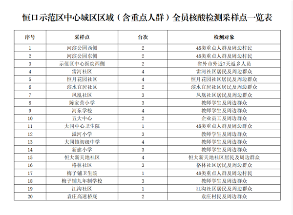 共設(shè)置20個采樣點、53個采樣臺(見附件),由相關(guān)責(zé)任單位統(tǒng)一負(fù)責(zé)采樣點設(shè)置、人員組織、秩序維護,檢測對象按現(xiàn)場工作人員要求,有序到指定地點進(jìn)行采樣,避免人員聚集。