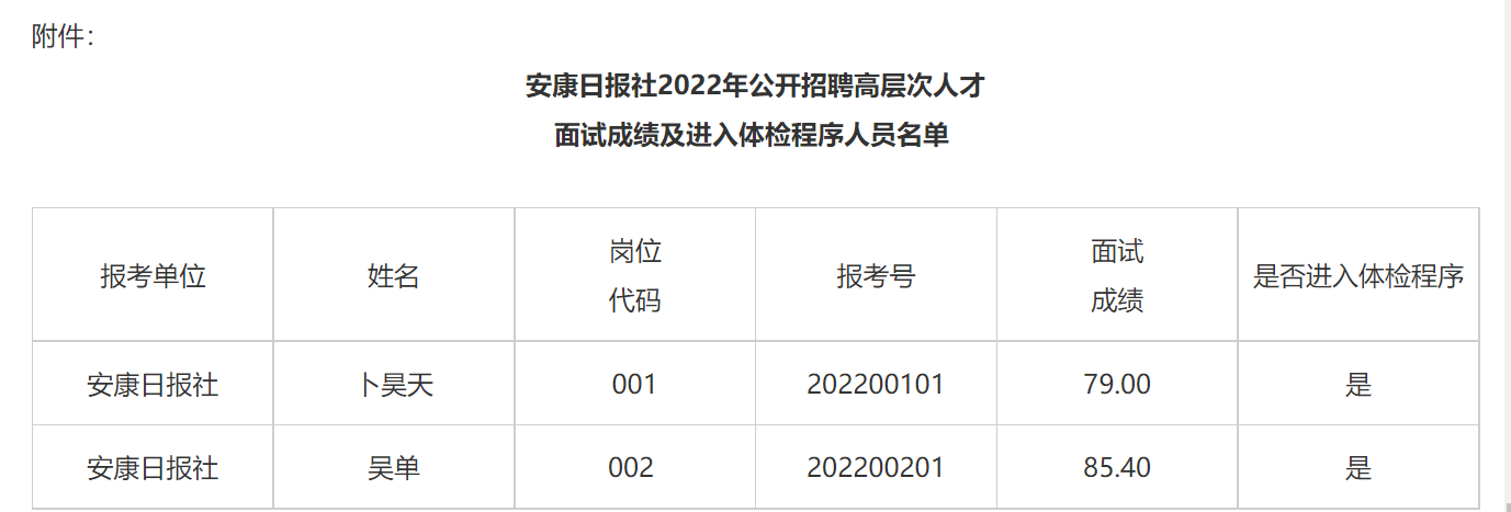 根據(jù)《安康日報(bào)社2022年公開招聘高層次人才公告》規(guī)定,現(xiàn)將安康日報(bào)社2022年公開招聘高層次人才面試成績及進(jìn)入體檢程序人員名單(見附件)、體檢有關(guān)事項(xiàng),公告如下: