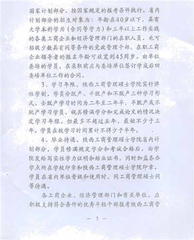 按照省政府有關(guān)文件規(guī)定,學(xué)員修滿規(guī)定的課程學(xué)分,完成畢業(yè)論文,通過論文答辯及評審后,由陜西工商管理碩士學(xué)院頒發(fā)畢業(yè)證書和學(xué)力證明。學(xué)員在省內(nèi)單位晉級和使用時,視同工商管理碩士。