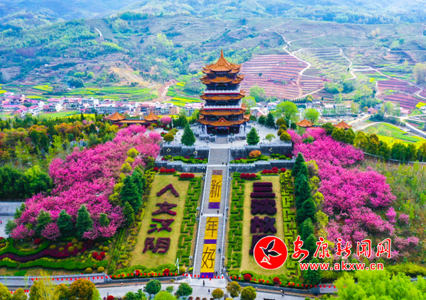 近日,在漢陰縣龍崗公園,成片櫻花競相開放,形成一片紅粉為主、白色點綴的爛漫花海,蔚為壯觀。