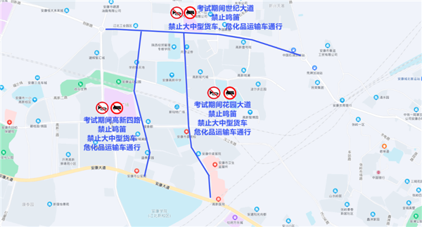 1、花園大道(安康大道至世紀(jì)大道)、世紀(jì)大道(新路口環(huán)島至五路口環(huán)島)、高新四路,所有通行車(chē)輛于6月6日21時(shí)至6月8日21時(shí),無(wú)論遇到何種情況,一律禁止鳴笛,禁止大中型貨車(chē)、?;愤\(yùn)輸車(chē)通行。