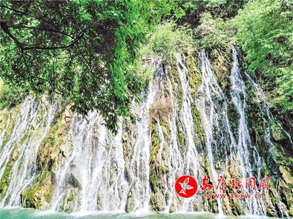 沿著木質(zhì)棧道前行,沒走多遠(yuǎn),耳中就傳來轟隆隆的水鳴聲,循聲望去,原來在大峽谷東南面的半山腰上有一掛巨大的瀑布。透過枝葉縫隙遙看瀑布的源頭,只見清清的泉水翻過一條石堰,從高高的崖壁口義無反顧地縱身飛躍而下,本是渾然一體的百米巨幅水簾,被凹凸不平的壁巖、樹枝、水草撕裂成形狀不一的一縷縷絹綢,千絲萬縷地交織著,撕扯著。細(xì)看,又猶如由萬千珍珠串起的珠簾,懸于半山腰間。瀑布四周彌漫著流云般的淡淡煙霞,初夏的陽光照耀著瀑布,折射出炫目的七彩光芒,形成一道道彩虹。粒粒珍珠流光溢彩、熠熠生輝。壁巖上嶙峋的怪石被水經(jīng)年累月地沖刷,早已失去了棱角,變得圓滑溫潤。因為潮濕的緣由,巖壁上鋪了一層厚厚的、碧綠的青苔,讓瀑布有了層次感,像極了妙手丹青繪制的巨幅山水壁畫,鮮活靈動。游人紛紛拿出手機(jī),在此排隊拍照、攝影留念。因它位于峽谷門口,似是迎接各位游客,故得名“迎賓瀑”。想到前幾日,朋友圈有人曬出聞名古今的廬山瀑布,只剩下一縷細(xì)細(xì)的溪流,從上面無力地流瀉下來,似是隨時都有中斷的可能,哪里還有“飛流直下三千尺,疑是銀河落九天”的氣勢時,不由得對眼前的這掛瀑布更加喜愛。