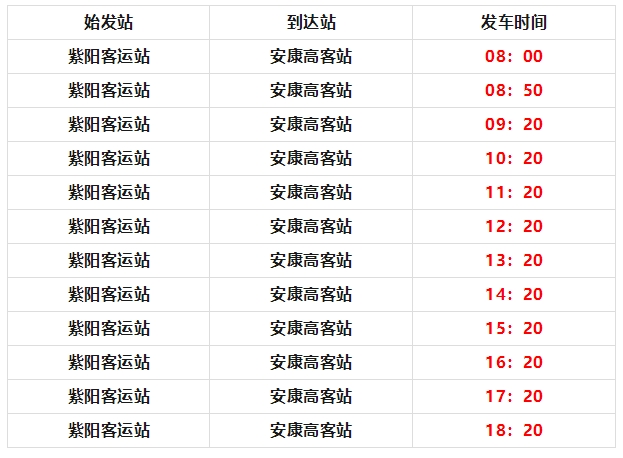紫陽客運站發(fā)往安康高速客運站,每日12班,發(fā)車時間為: