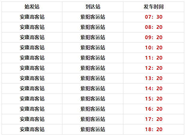 安康高速客運站發(fā)往紫陽汽車站,每日12班,發(fā)車時間為:?