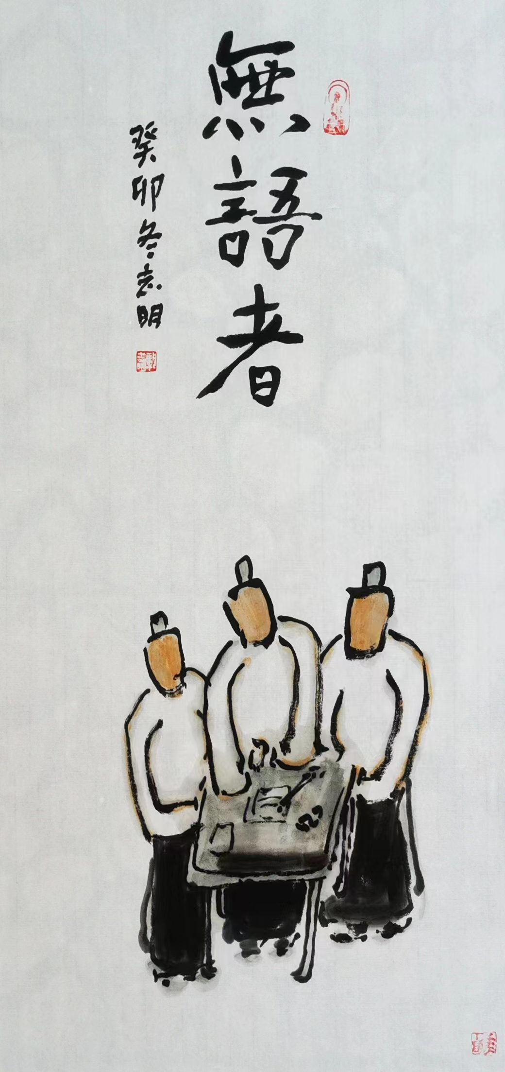 記得那一年的端午節(jié),鞏志明發(fā)來短信,是他寫的一首詩:綠粽黃酒聚江邊,白帆紅燭祭屈原。三千清淚流不得,九萬渾念飄上天。誰有郁悶誰散淡,何謂圓滑何忠奸。十丈風(fēng)塵古今在,談笑真?zhèn)位聼煛?017年,我遷新居,鞏老師為我寄來小品畫《福到眼前》,我很喜歡,并懸掛至新居玄關(guān)。這些年,鞏志明老師常做影展畫展策劃及影評講座,自已也臨池不輟,水墨丹青,寄情抒懷,他的文人小品有思想性、有創(chuàng)造性。雖畫的是松風(fēng)明月,小舟流水或遠(yuǎn)古人物,但都寄托了他當(dāng)下的心境,以消塊壘。誠如有人評論他為“吾師真文人,畫亦真性情!”他不僅只是身居畫室的怡情文人,他亦是心憂天下的豪俠。面對世間不平事,他也是激揚文字,揮斥方遒!在功利的當(dāng)下,鞏志明尤其顯得難能可貴!?