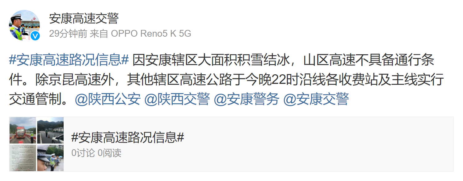 據(jù)安康高速交警消息:因安康轄區(qū)大面積積雪結冰,山區(qū)高速不具備通行條件。除京昆高速外,其他轄區(qū)高速公路于今晚(2月22日)10時沿線各收費站及主線實行交通管制。?