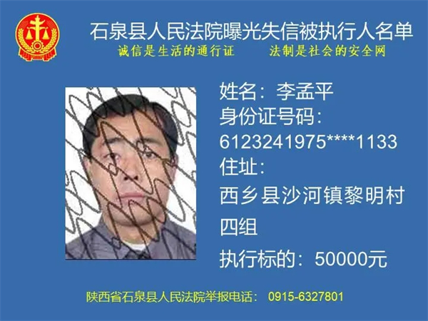為了進(jìn)一步加大執(zhí)行力度,保障勝訴當(dāng)事人的合法權(quán)益,推進(jìn)社會誠信體系建設(shè),依照《中華人民共和國民事訴訟法》《最高人民法院關(guān)于公布失信被執(zhí)行人名單信息的若干規(guī)定》等法律、司法解釋的有關(guān)規(guī)定,現(xiàn)對一批已進(jìn)入執(zhí)行程序,且尚未全部履行義務(wù)的被執(zhí)行人進(jìn)行媒體曝光,歡迎廣大群眾支持石泉縣人民法院的工作,向我院提供被執(zhí)行人的財(cái)產(chǎn)線索,使生效法律文書能夠得到切實(shí)執(zhí)行,讓人民群眾切實(shí)感受到公平正義就在身邊。