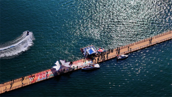 游客輾轉(zhuǎn)至瀛湖浮橋,水上運(yùn)動(dòng)中心也已喬遷至此。精彩刺激的水上項(xiàng)目,吸引了年輕人的極大興趣。水上摩托艇、水上陀螺、水上拖傘。以及靜態(tài)水域的水上滾筒、水上皮劃艇、水上手搖船,都成了游客今年第一次親水的最佳載體,怎一個(gè)酣暢了得。