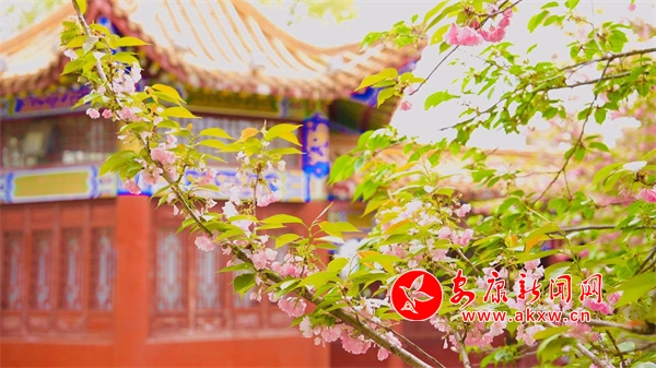 在龍崗閣兩側(cè),淺白和粉紅的櫻花一團團、一簇簇在藍(lán)天白云的映襯下,在枝頭舞蹈,伴隨著微風(fēng),陣陣花香四溢,沁人心脾。置身其間,繁花耀眼,香飄四溢,唯美景色引人入勝。