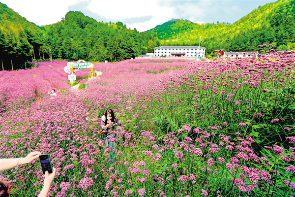 中秋節(jié)期間,平利千家坪森林公園天書峽馬鞭草花競(jìng)相怒放。如畫的景色吸引眾多游客前來賞景打卡。(詹永桂 攝)