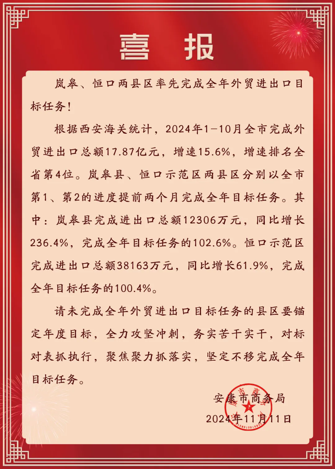 ?近日,市商務(wù)局發(fā)來(lái)喜報(bào),恒口示范區(qū)率先完成全年外貿(mào)進(jìn)出口目標(biāo)任務(wù)。