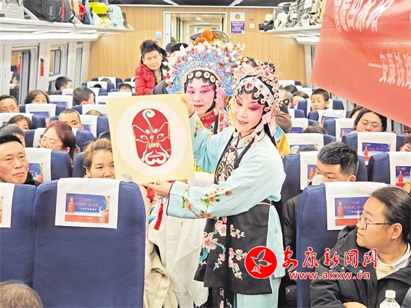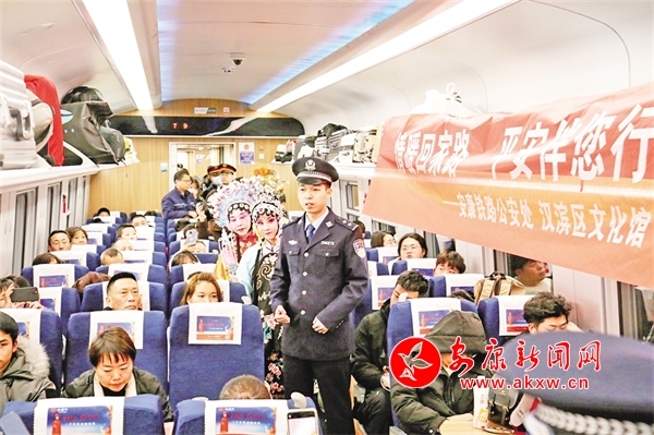 火車穿越秦巴山水間,途中,來自安康漢調(diào)二黃研究院的專業(yè)演員和地方民間漢調(diào)二黃愛好者們一同表演了國(guó)家級(jí)非物質(zhì)文化遺產(chǎn)——漢調(diào)二黃經(jīng)典戲曲演唱,并為旅客們講解漢調(diào)二黃戲曲知識(shí),與旅客們開展互動(dòng)交流,讓旅客親身體驗(yàn)漢調(diào)二黃戲服道具,感受漢調(diào)二黃的獨(dú)特藝術(shù)魅力。來自漢濱區(qū)文化館的漢濱剪紙技藝傳承人為旅客們展示講解了安康市級(jí)非物質(zhì)文化遺產(chǎn)——漢濱剪紙技藝,向參與互動(dòng)的旅客送上了親手創(chuàng)作的漢濱剪紙作品,提前送上新春祝福?;顒?dòng)中,西安鐵路公安局安康公安處的民警們和文藝工作者們一同宣傳普及了反詐知識(shí),進(jìn)一步提升旅客的安全防范意識(shí)。