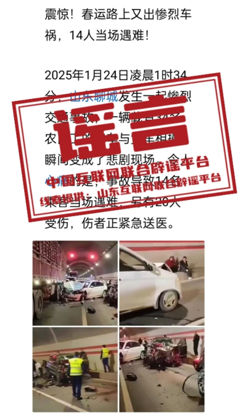 真相:近日,有網(wǎng)民在網(wǎng)絡(luò)平臺發(fā)布一則“山東聊城一隧道內(nèi)發(fā)生多車相撞”的信息,稱“現(xiàn)場多車發(fā)生嚴重碰撞,場面慘烈,群眾滯留”,引發(fā)關(guān)注。經(jīng)當?shù)鼐胶藢?,山東省聊城市從未發(fā)生過類似交通事故,該信息內(nèi)容純屬虛假編造。經(jīng)查,網(wǎng)民褚某某和韓某為博取關(guān)注、吸引流量,將外省市發(fā)生交通事故的圖片視頻移花接木,稱“聊城發(fā)生交通事故”并憑空捏造傷亡人數(shù),造成不良影響。目前,二人已被公安機關(guān)依法打擊處理。(來源:山東互聯(lián)網(wǎng)聯(lián)合辟謠平臺、聊城市網(wǎng)上辟謠平臺)
