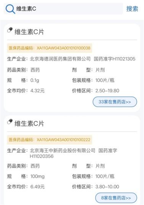 第四步:以搜索維生素C為例,可以看到下方展示了在售的相關(guān)商品及價格等信息。
