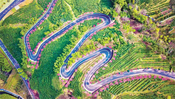 沿著茶山步道拾級而上,茶農(nóng)采青的竹簍與游人拍照的紗巾在梯田間次第閃現(xiàn)。粉白相間的梅花如云絮般綴滿枝頭,風過處,花瓣簌簌落入茶叢,為嫩綠的新芽染上淡淡馨香。遠處黛瓦白墻的徽派民居與近處起伏的茶壟構(gòu)成天然畫框,無人機視角下,蜿蜒的茶道如同玉帶纏繞山腰,將紅楓、櫻花、梅林串成斑斕的珠鏈。