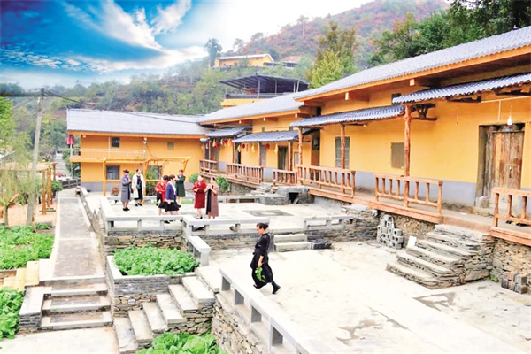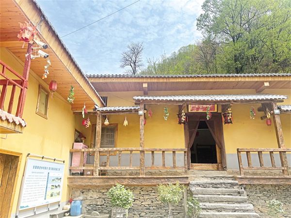 藍(lán)天、白云、清風(fēng)、朗日、松林……一切慵懶舒適得剛剛好。一路盤繞,繞道幾彎桃紅柳綠、野花盛開的山道,掠過(guò)桃紅李白郁郁蔥蔥的樹林,周家院子便毫無(wú)征兆地映入眼簾。隔墻遠(yuǎn)瞧,院內(nèi)房屋呈L形鋪展開來(lái),房梁上懸掛的金黃色玉米穗、燦若紅霞的辣椒展示著農(nóng)家物產(chǎn)豐饒的鄉(xiāng)野特色,犁彎、犁脖、犁鏵,述說(shuō)著院子主人的勤勞與殷實(shí)。而一串串醒目的大紅燈籠,展示著主人的幸福生活和對(duì)未來(lái)的美好憧憬。