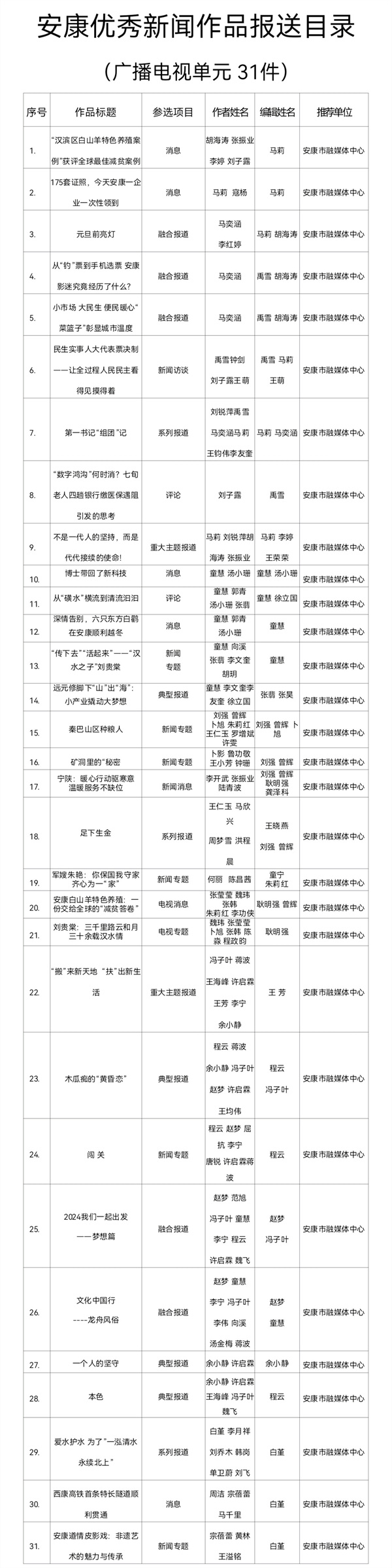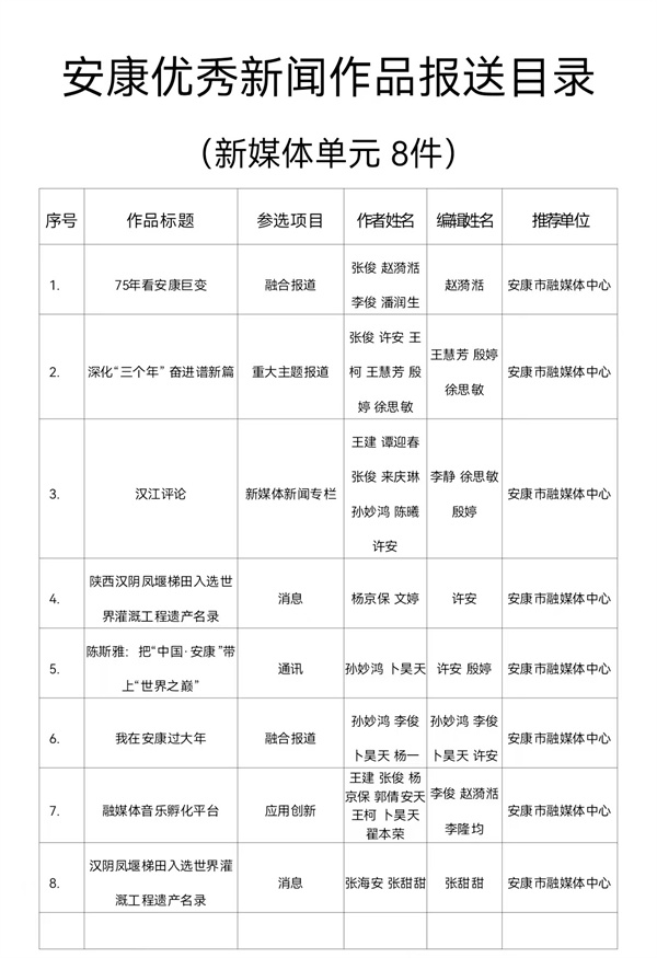 根據(jù)《關于開展2024年度安康優(yōu)秀新聞作品、安康市優(yōu)秀新聞工作者推選工作的通知》(安記協(xié)〔2025〕04號)文件要求,經(jīng)推薦、領導審核,安康市融媒體中心推薦參評2024年度安康優(yōu)秀新聞作品97件(報紙單元58件,廣播電視單元31件,新媒體單元8件)?,F(xiàn)將報送作品目錄(詳見附件)予以公示。