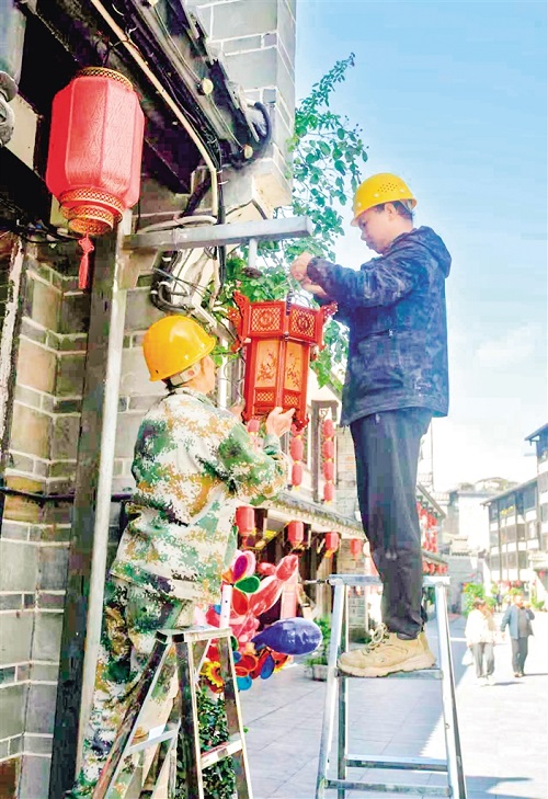 9月24日,石泉縣積極籌備國慶黃金周旅游服務保障工作。圖為石泉縣漢江古城景區(qū),工作人員正在更換景觀燈。?