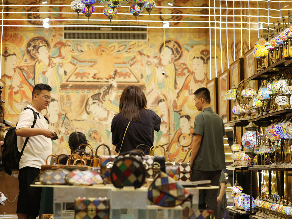 ??2025年6月26日,游客在敦煌夜市選購文創(chuàng)產(chǎn)品。今年以來,敦煌市全面改造敦煌夜市等特色街區(qū),圍繞敦煌深厚的歷史文化底蘊,融入壁畫、絲路文化等元素,通過布設(shè)文化景觀小品、打造沉浸式餐飲體驗空間、上線特色文創(chuàng)產(chǎn)品等方式,給游客帶來多元體驗,“夜經(jīng)濟”持續(xù)升溫,不斷釋放文旅消費潛力。