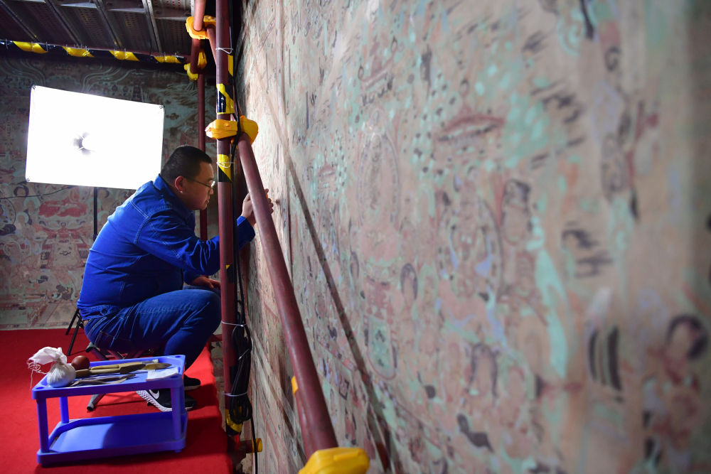??2022年4月19日,敦煌研究院文物保護技術(shù)服務(wù)中心的壁畫修復(fù)師楊金禮在莫高窟第231窟內(nèi)修復(fù)壁畫。