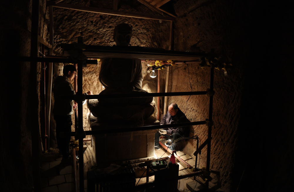 ??2024年11月2日,麥積山石窟藝術(shù)研究所保護研究室的文物修復(fù)師何舉在麥積山石窟133窟內(nèi)修復(fù)塑像。近年來,麥積山石窟藝術(shù)研究所等文物保護部門持續(xù)加大對麥積山石窟的搶救性保護和預(yù)防性保護工作力度,積極探索現(xiàn)代科學(xué)技術(shù)手段與傳統(tǒng)文物修復(fù)技藝相結(jié)合的保護修復(fù)新路徑。截至目前,麥積山石窟已有80個洞窟完成整體保護修復(fù)工作。