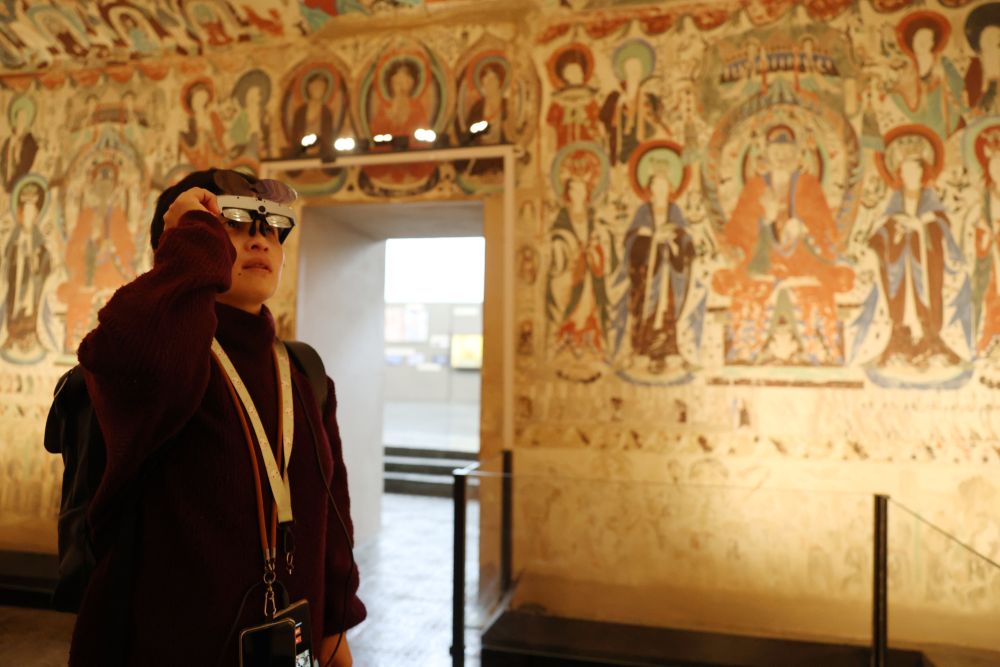 ??2025年10月30日,在敦煌石窟文物保護研究陳列中心,游客使用AR設(shè)備在復(fù)制洞窟參觀體驗。
