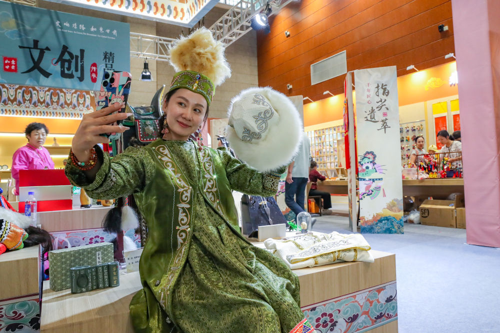 ??2025年9月22日,游客在敦煌文博會上身穿民族服飾自拍。9月20日至22日,第八屆絲綢之路(敦煌)國際文化博覽會在敦煌市舉行。敦煌研究院“典范”“高地”建設(shè)成果展、甘肅文旅非遺文創(chuàng)展、敦煌·絲路雕塑展等多項展覽同步亮相,集中展現(xiàn)了敦煌文化遺產(chǎn)保護、研究、弘揚的最新成果以及共建“一帶一路”國家的文化藝術(shù)、非遺文創(chuàng)、風(fēng)土人情等精彩內(nèi)容。