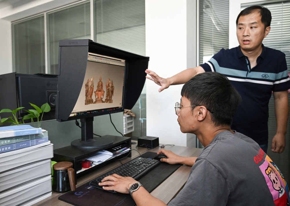 ??2023年8月3日,敦煌研究院文物數(shù)字化研究所的工作人員在展示莫高窟彩塑三維重建的成果。近年來,敦煌研究院持續(xù)加大文物保護基礎(chǔ)研究和應(yīng)用研究,不斷加強文物科技保護力度,提升科研平臺建設(shè),為文物保護和文化遺產(chǎn)事業(yè)發(fā)展奠定良好基礎(chǔ)。