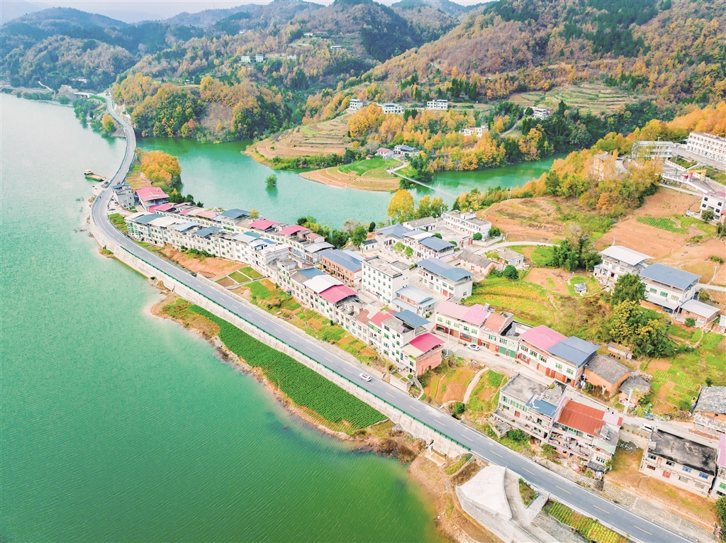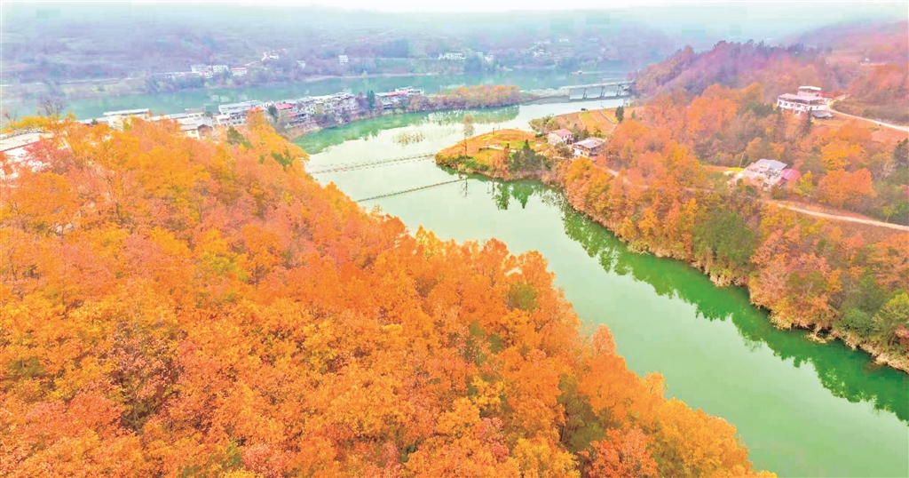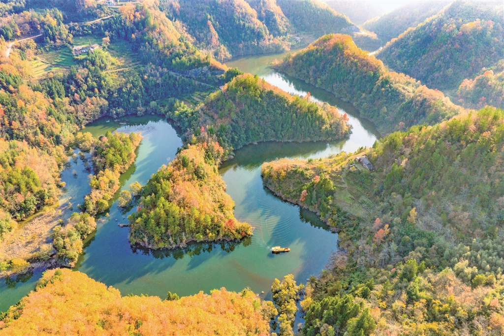 夕陽(yáng)下的沙坪河,斑斕山林與澄澈水色繪就成一幅靈動(dòng)的水鄉(xiāng)畫卷。郭浩 攝