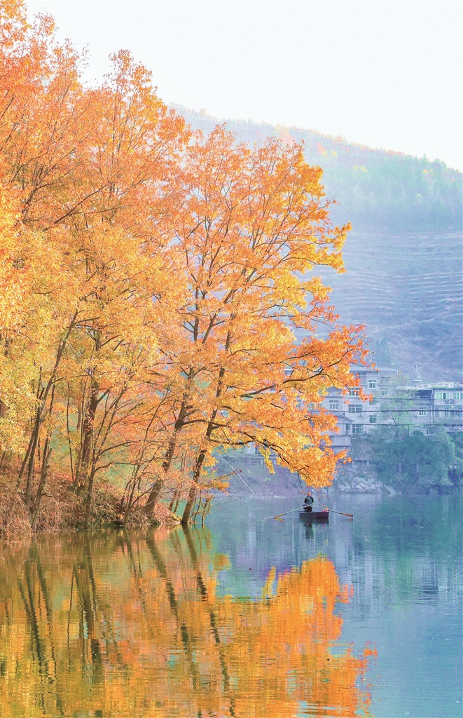 待到霧散天青,沙坪河便展露出它清澈的容顏。兩岸層林盡染,漫山的斑斕都被河水溫柔收納。一川碧水如鏡,完整復(fù)刻出天空與彩林的倒影,虛實(shí)交錯(cuò),舟行其上,仿佛滑入一幅靜止的油畫。山偎著水,水映著山,靜謐而又絢爛。?