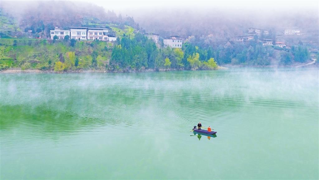寒冬時(shí)節(jié),瀛湖蓄水,沙坪河展現(xiàn)出不同往昔的靜謐風(fēng)姿。清晨,薄霧如紗,輕輕覆于江面。遠(yuǎn)山輪廓在氤氳中淡去,近水卻愈顯澄明,倒映著天際微光。時(shí)有早行的客船從霧中緩緩現(xiàn)出身形,馬達(dá)聲不時(shí)驚起三兩水鳥;漁人輕搖小舟,如在云中穿行。這朦朧流動(dòng)的晨景,恍若水墨漫染的仙境。