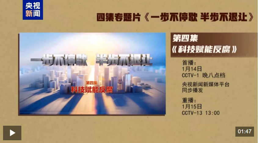 電視專題片《一步不停歇 半步不退讓》第四集《科技賦能反腐》,講述紀檢監(jiān)察機關豐富防治新型腐敗和隱性腐敗有效辦法,以信息化賦能正風反腐,充分運用科技手段精準發(fā)現(xiàn)不正之風和腐敗問題線索、迅速有效突破案件,著力提升智慧反腐、科技反腐水平。總臺央視綜合頻道1月14日晚8點檔播出,央視新聞新媒體平臺同步播發(fā)。