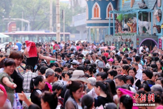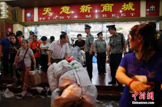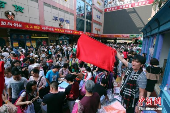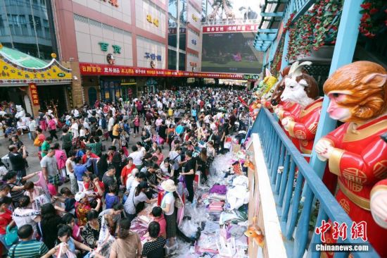 9月15日,商戶聚集在北京天意商城門口甩賣商品,吸引大批顧客搶購。天意商城是北京規(guī)模最大的小商品批發(fā)兼零售市場,為疏解北京非首都功能,天意商城將于9月16日關(guān)門停業(yè)。中新社記者 盛佳鵬 攝
