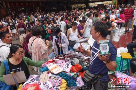 9月15日,天意商戶舉起二維碼方便顧客掃碼支付,以新式支付方式助力傳統(tǒng)零售。當(dāng)日,自1992年開業(yè)至今的北京天意市場迎來其在北京西城阜外大街營業(yè)的最后一日,商家趁機“瘋狂甩貨”,大批北京民眾也紛至沓來。這里曾是北京著名的小商品商城,聚集了數(shù)千家商戶。為疏解北京非首都功能,天意商城將于本月16日關(guān)門停業(yè)。中新社記者 崔楠 攝