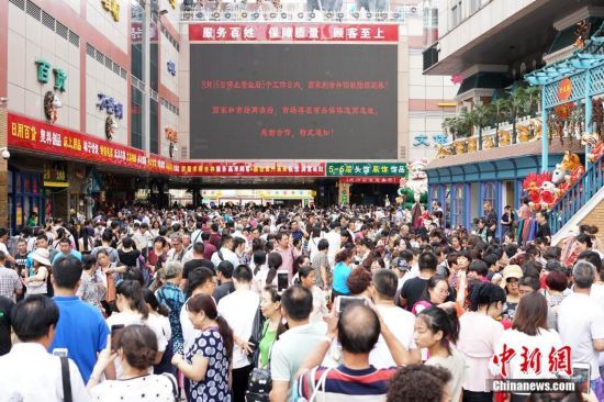 9月15日,市民齊聚天意批發(fā)市場中購物。天意商城是北京規(guī)模最大的小商品批發(fā)兼零售市場,為疏解北京非首都功能,天意商城將于本月16日關(guān)門停業(yè)。中新社記者 韓海丹 攝