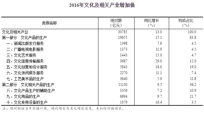 數(shù)據(jù)顯示,根據(jù)《文化及相關(guān)產(chǎn)業(yè)分類(2012)》和《文化及相關(guān)產(chǎn)業(yè)增加值核算方法》的規(guī)定和要求,經(jīng)核算,2016年全國(guó)文化及相關(guān)產(chǎn)業(yè)增加值為30785億元,比上年增長(zhǎng)13.0%(未扣除價(jià)格因素,下同),比同期GDP名義增速高4.4個(gè)百分點(diǎn);占GDP的比重為4.14%,比上年提高0.17個(gè)百分點(diǎn)。2016年文化及相關(guān)產(chǎn)業(yè)保持平穩(wěn)快速增長(zhǎng),比重穩(wěn)步上升,對(duì)促進(jìn)經(jīng)濟(jì)轉(zhuǎn)型升級(jí)、平穩(wěn)健康可持續(xù)發(fā)展發(fā)揮了重要作用。