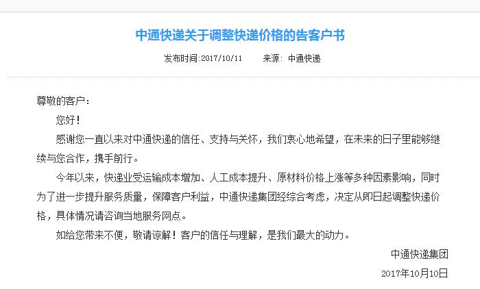 而中通快遞于10月10日也公布漲價訊息,官網刊文稱,中通快遞集團經綜合考慮,決定從即日起調整快遞價格,具體情況請咨詢當?shù)胤⻊站W點。