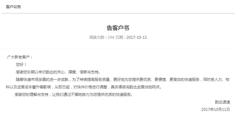 10月11日,韻達快遞官網發(fā)布《告客戶書》,表示為提供更優(yōu)質、更便捷、更高效的快遞服務,同時受人力、物料以及運營成本攀升等影響,從即日起,對快件價格進行調整,具體請咨詢韻達全國當?shù)鼐W點。