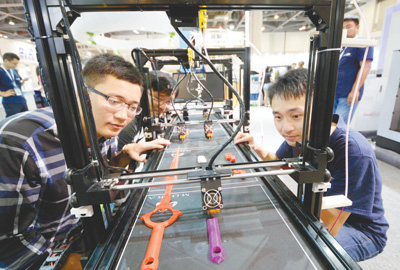 | 2017中國(guó)增材制造大會(huì)暨展覽會(huì)7月在杭州國(guó)際博覽中心舉行。圖為觀眾參觀一臺(tái)生產(chǎn)型3D打印機(jī)。 |