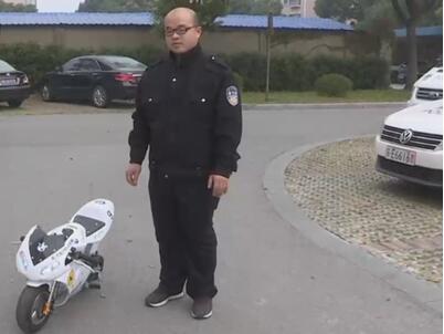 這輛白黑相間,同時(shí)有著寶馬和保時(shí)捷標(biāo)志的車輛,就是民警剛剛被查獲的迷你摩托車。油箱、油門、剎車一樣也不少,只是這個(gè)頭,相比旁邊的警摩來說足足小了三四圈。這是11月2號下午兩點(diǎn),警察在吳江云龍路上查處的車輛。監(jiān)控上可以看到駕駛員被查后,用一個(gè)手抬起后輪,就輕松推走了這輛車。