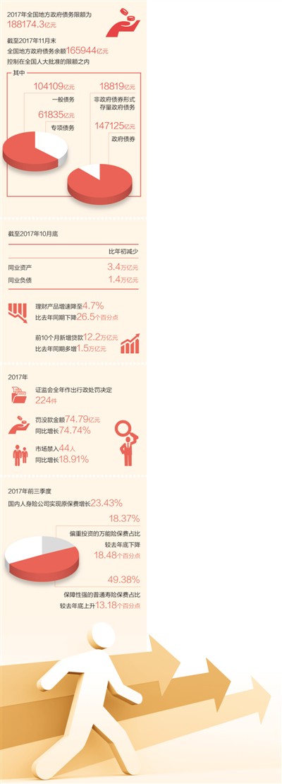 防風險大幕開啟于2017年。這一年,監(jiān)管部門專項整治市場亂象,彌補制度短板,引導金融機構(gòu)回歸本源,專注主業(yè),增強服務實體經(jīng)濟能力。2018年金融防風險將在哪些重點領域出手?投資者和企業(yè)等市場主體如何看待防風險?怎樣建立防風險的長效機制,從根源上遏制風險產(chǎn)生的苗頭?我們從銀行業(yè)、資本市場、保險業(yè)和地方融資平臺四個領域,聚焦2017年防風險的主要成效,反映企業(yè)、投資者、金融機構(gòu)的實際感受和來年期盼,共同探討構(gòu)筑今年金融業(yè)防風險屏障的有效路徑。