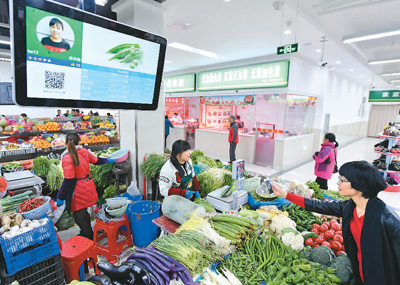 | 2017年11月29日,在安徽合肥瑤海區(qū)勝利智能農貿市場,市民在掃碼支付。 |