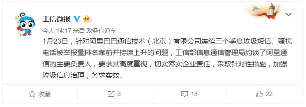人民網(wǎng)北京1月24日電 據(jù)工業(yè)和信息化部信息中心官微@工信微報消息,昨日,針對阿里巴巴通信技術(shù)(北京)有限公司連續(xù)三個季度垃圾短信、騷擾電話被舉報量排名靠前并持續(xù)上升的問題,工信部信息通信管理局約談了阿里通信的主要負責(zé)人,要求其高度重視,切實落實企業(yè)責(zé)任,采取針對性措施,加強垃圾信息治理,務(wù)求實效。(朱江)LQm安康新聞網(wǎng)