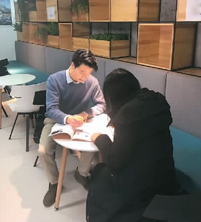 圖為陳戈(左)與同事探討關(guān)于留學(xué)生二手交易中存在問題的調(diào)研結(jié)果。