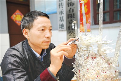 今年52歲的貴州省臺(tái)江縣施洞鎮(zhèn)崗黨略村塘龍寨苗族工匠吳水根,從事苗族銀飾加工30余年。其加工的銀飾造型具有鮮明的民族特色和地域特色。2012年,吳水根被評(píng)為第四批國(guó)家級(jí)非物質(zhì)文化遺產(chǎn)項(xiàng)目名錄《銀飾鍛制技藝(苗族銀飾鍛制技藝)》代表性傳承人。圖為3月2日,吳水根在院子里制作銀帽。FdJ安康新聞網(wǎng)