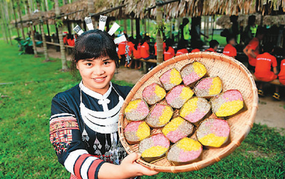 | 旅游扶貧使海南貧困黎鄉(xiāng)——小妹村脫貧致富。圖為小妹村的一名黎族姑娘展示黎族特色食品——三色飯。 |
