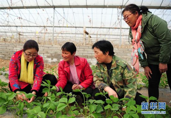 楊育英(左一)在自家果蔬大棚內(nèi)與員工交流育苗技術(shù)(3月20日攝),F(xiàn)年45歲的楊育英早前并不從事農(nóng)業(yè)。她19歲開始到北京打工,先是做推銷員,后來(lái)專門從事設(shè)施農(nóng)業(yè)設(shè)備的生產(chǎn)。看到設(shè)施農(nóng)業(yè)前景廣闊,她2008年帶著技術(shù)和資金回到陜西渭南老家,搞起了葡萄種植。建大棚、配設(shè)施、引苗木,很快她就建起了渭南裕美現(xiàn)代農(nóng)業(yè)設(shè)施示范園,并先后引進(jìn)了36個(gè)葡萄品種。問起成功的秘訣,她坦言得益于她的“朋友圈”。新華社發(fā)(張博文 攝)
