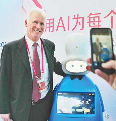 4月9日,清潔能源論壇首席執(zhí)行官薄銳思在體驗互動后與小i機器人合影。DNx安康新聞網(wǎng)